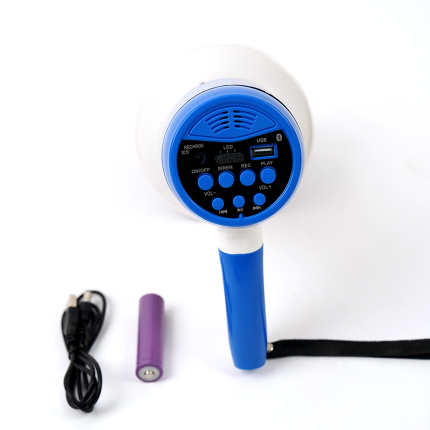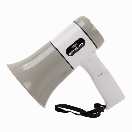 MEGÁFONO RECARGABLE BATBLACK 220W, USB, BLUETOOTH, CON GRABACION 100 SEG. BATERÍA 3.7X3 2200 MSH, IMPUT VOLTAJE DC 5V 1A-2A ENTRADA AUXILIAR ENTRADA DC 12V, CABLE TIPO C. SONIDO DE EMERGENCIA Y MUSICAL