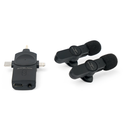 2 MICROÓFONOS SOLAPEROS INALÁMBRICOS BATBLACK 3 EN 1, 2.4GHZ, 360° OMNIDIRECCIONAL, PARA GRABACION EN VIVO, 2 CABLES DE CARGA TIPO C, 1RECEPTOR INGRESO STERO PLUG,T/C,T/IPHONE REGARABLES.