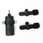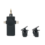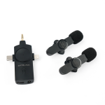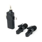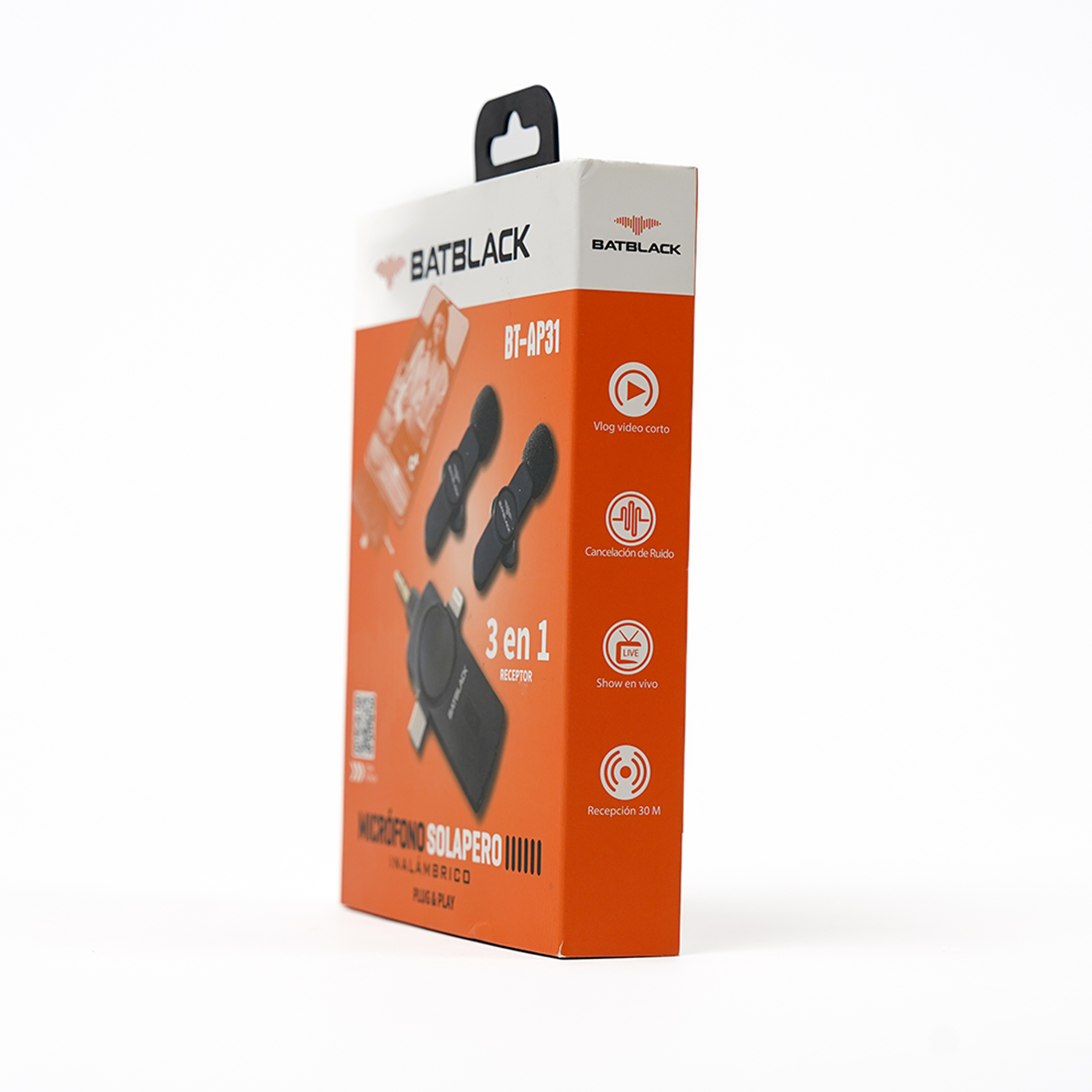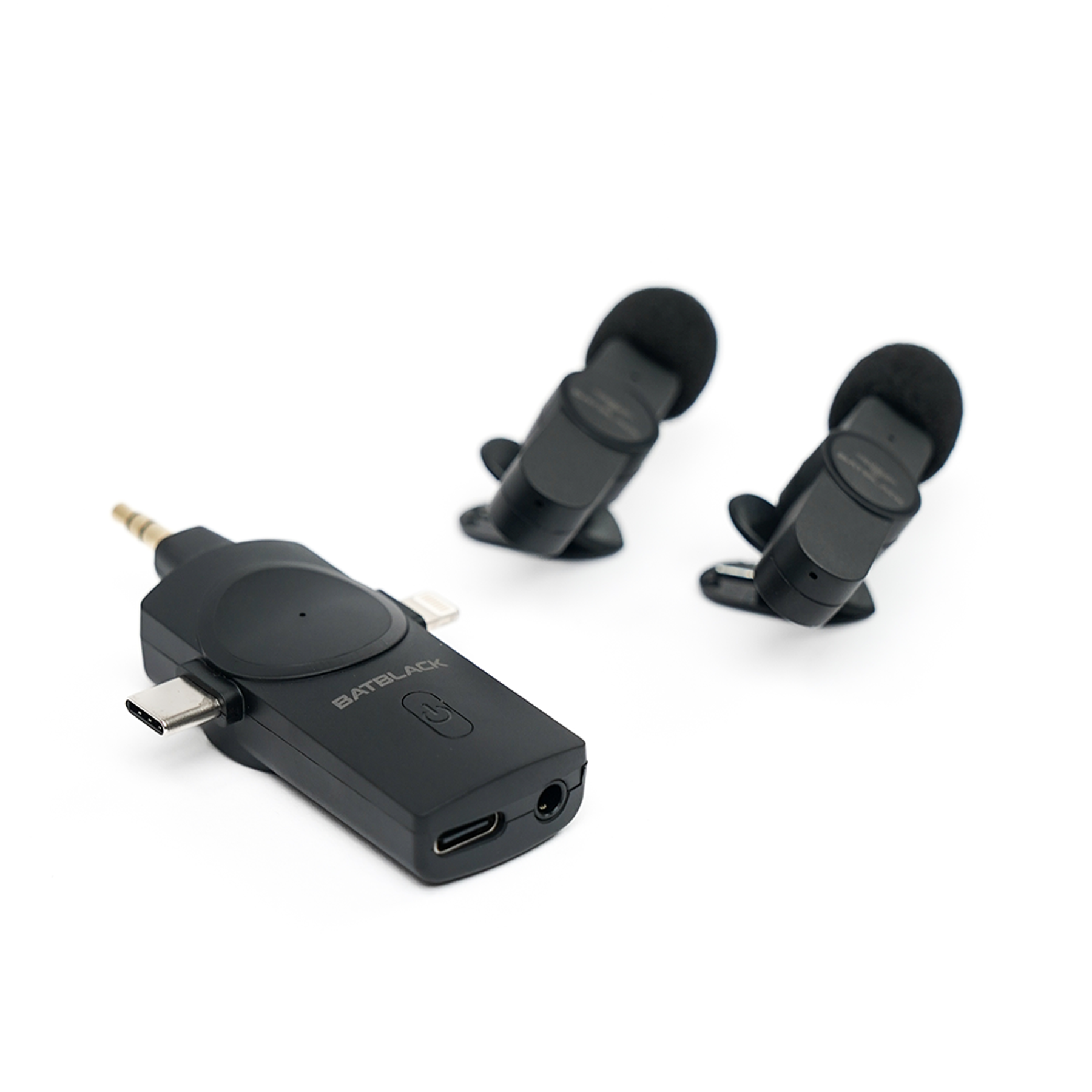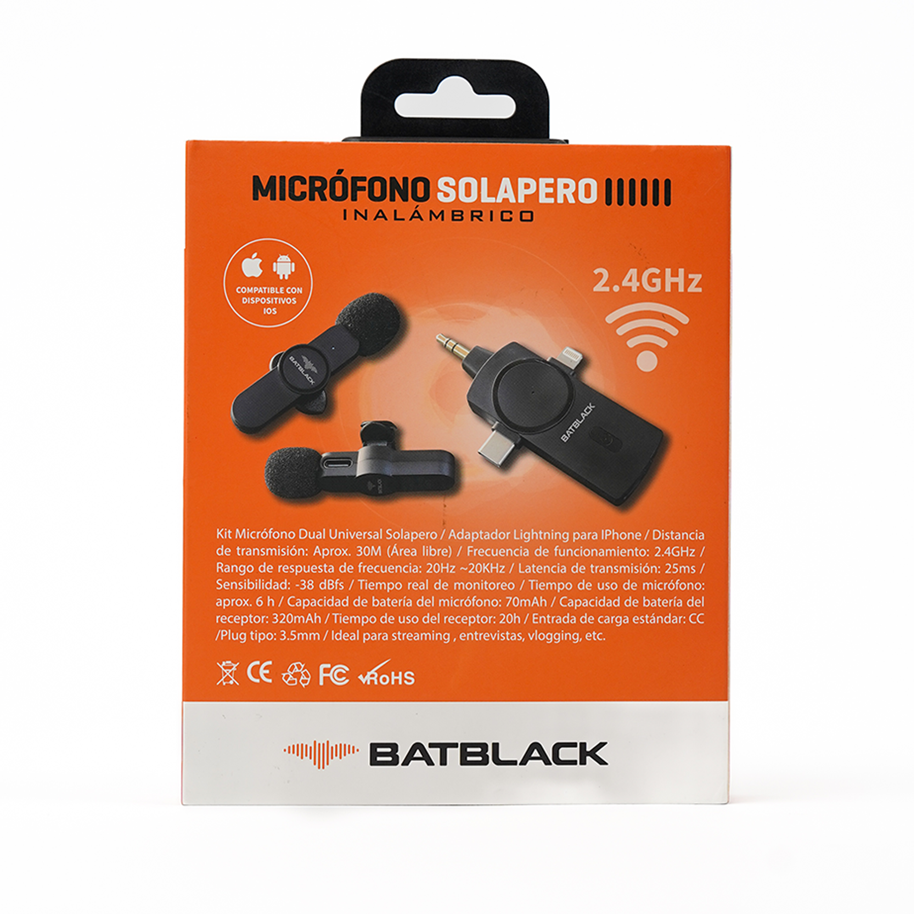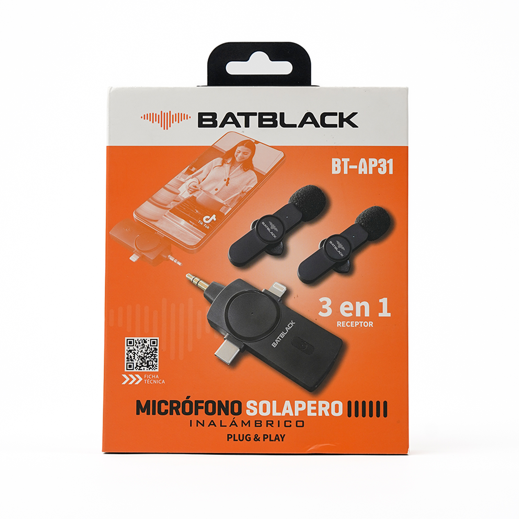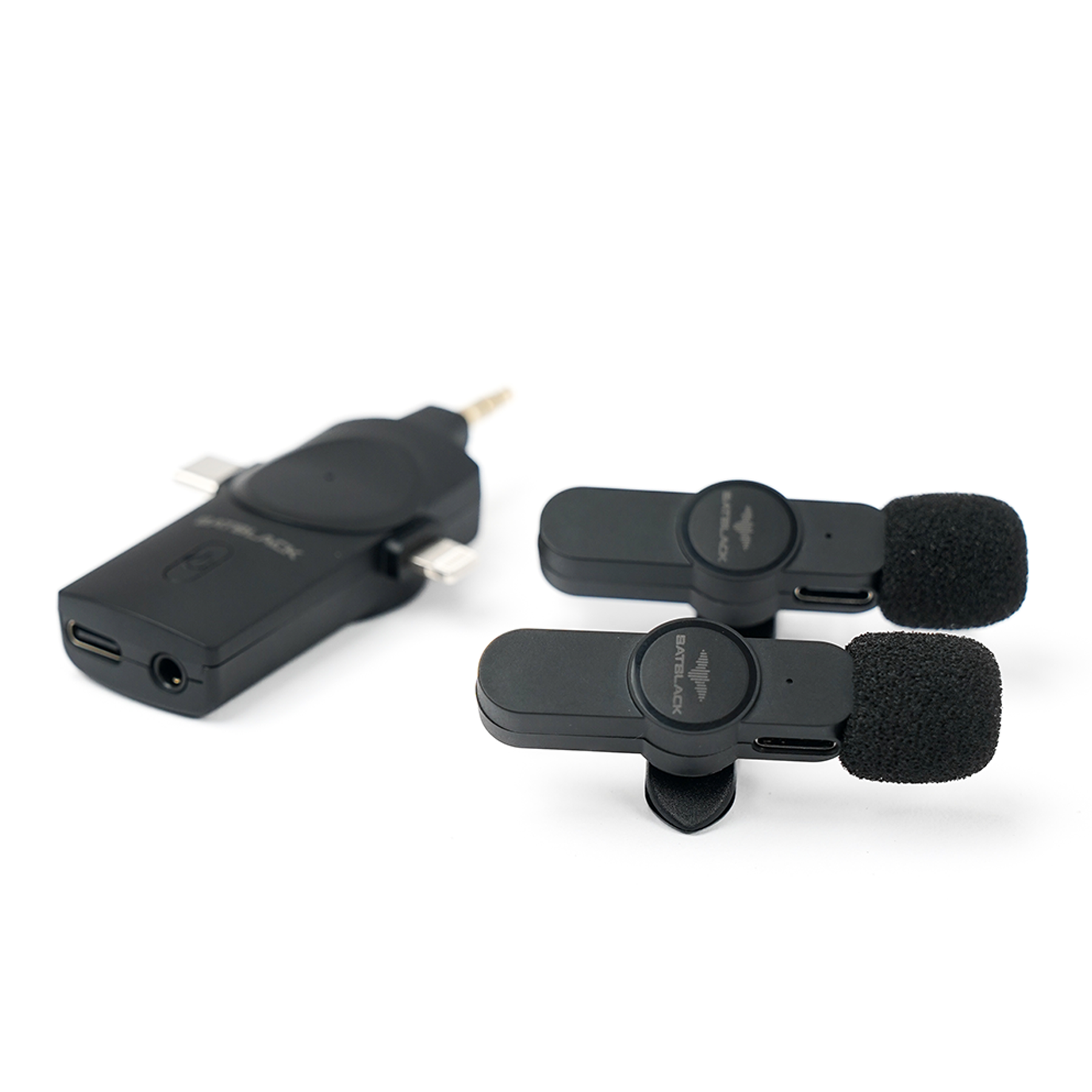 2 MICROÓFONOS SOLAPEROS INALÁMBRICOS BATBLACK 3 EN 1, 2.4GHZ, 360° OMNIDIRECCIONAL, PARA GRABACION EN VIVO, 2 CABLES DE CARGA TIPO C, 1RECEPTOR INGRESO STERO PLUG,T/C,T/IPHONE REGARABLES.