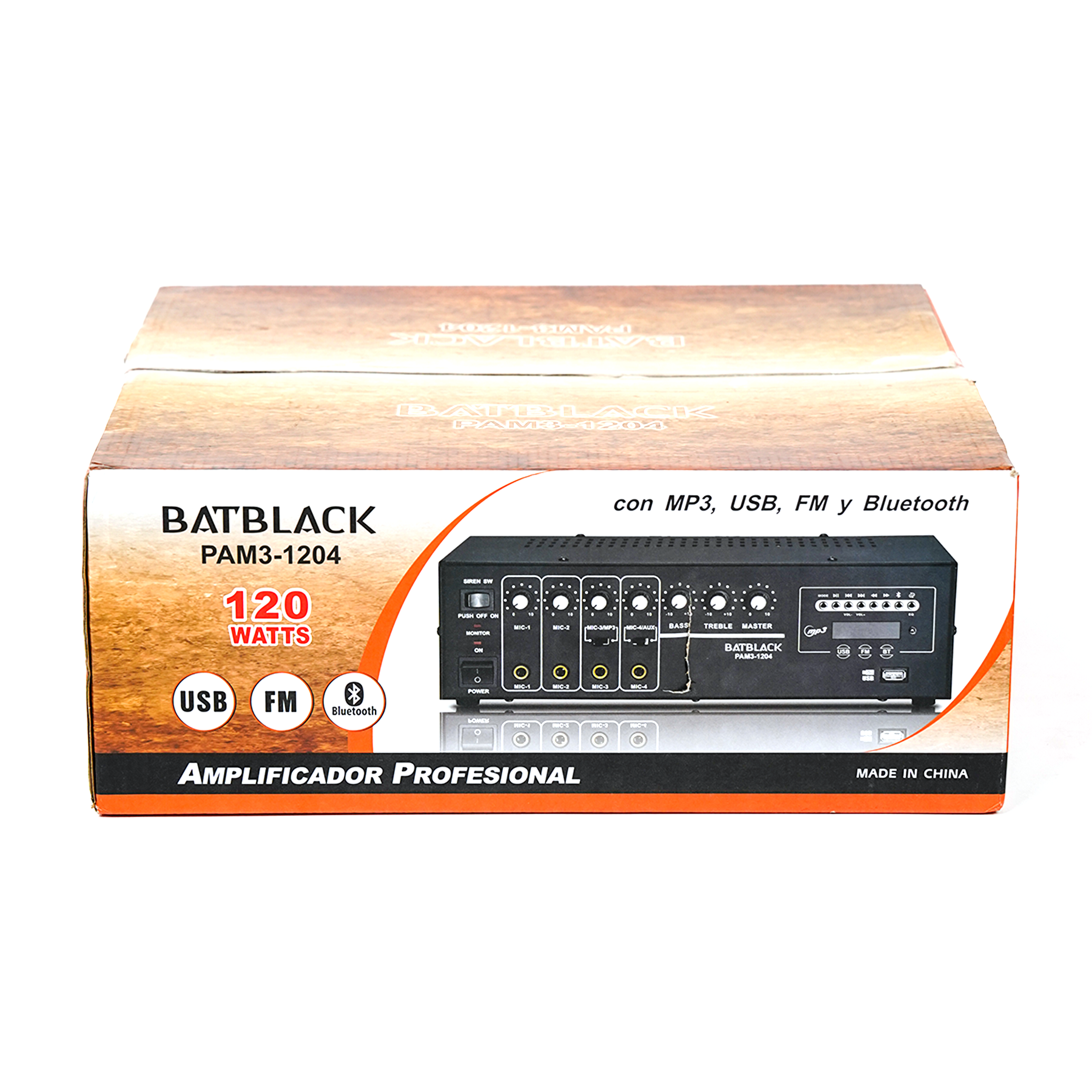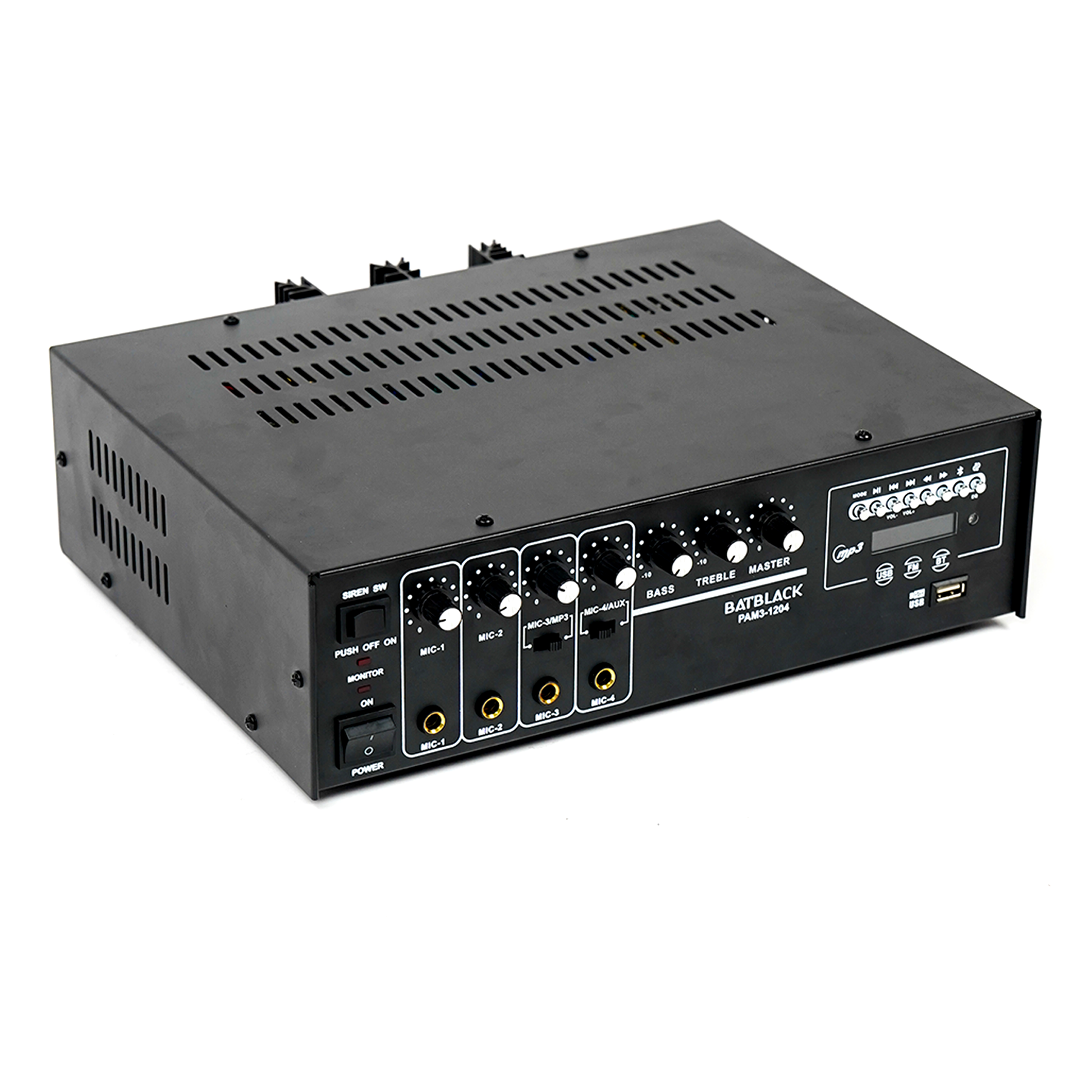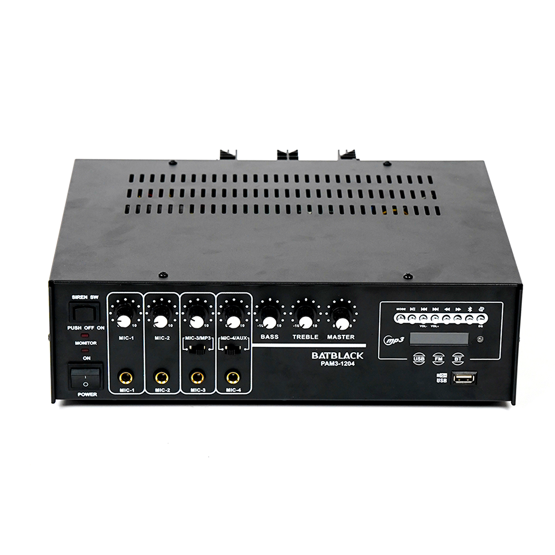 AMPLIFICADOR PROFESIONAL BATBLACK 120W P/4 MICROS AC 220V/60HZ MP3,USB,FM, BT C/SIRENA C/CONTROL