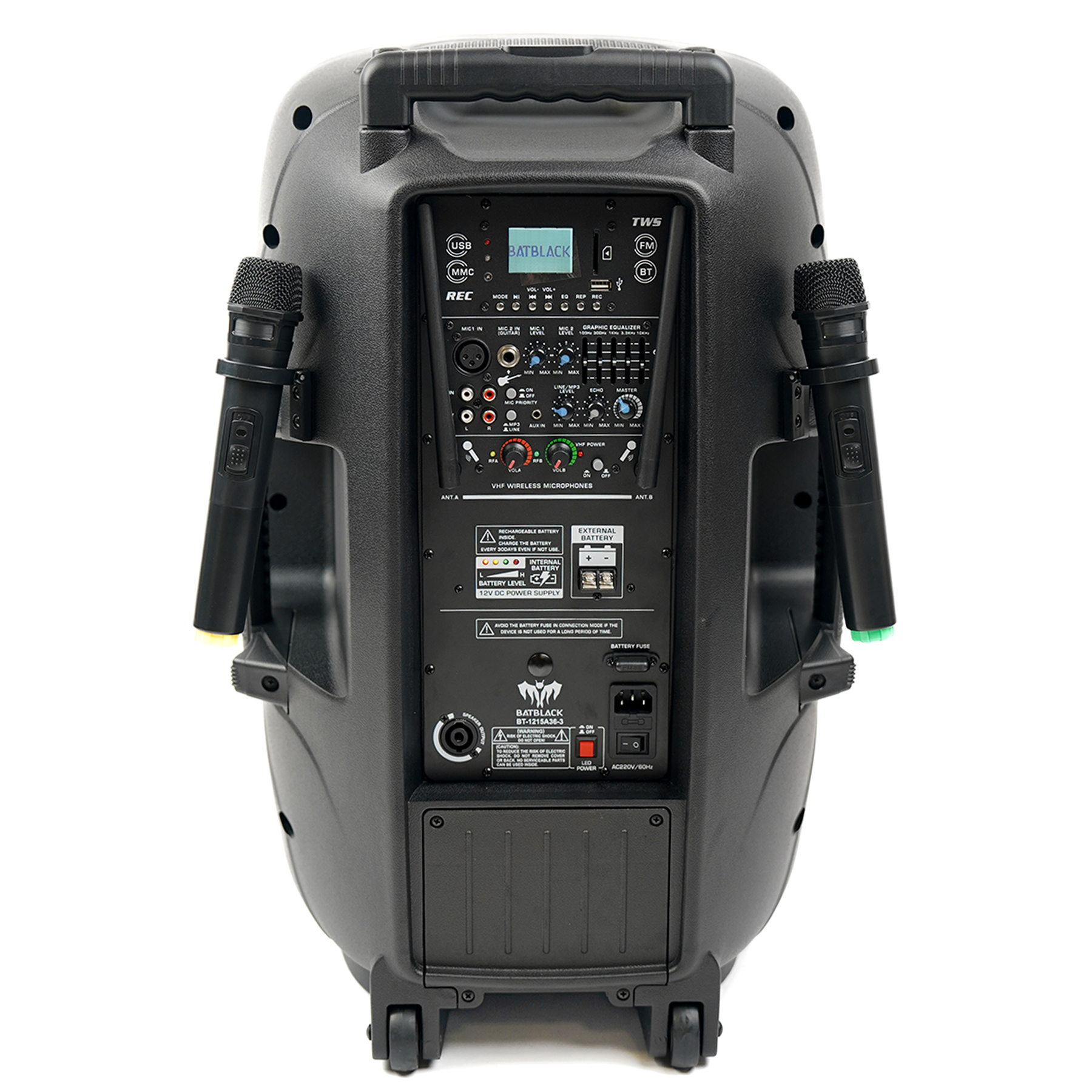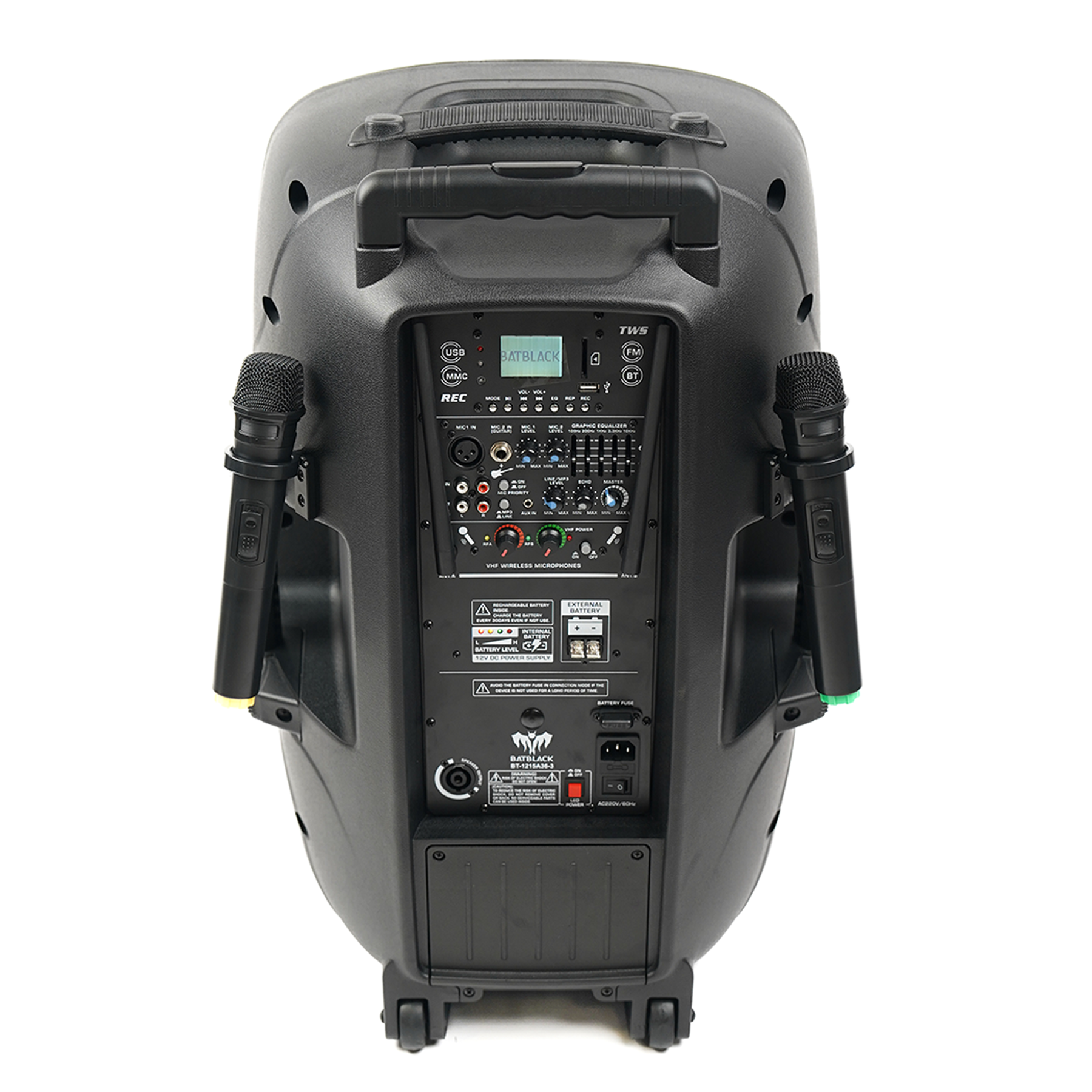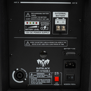 PARLANTE AMPLIFICADO BATBLACK 15″ 3000W CON BT, FM, USB, SD CARD,TWS C/2 MICROFONOS INALÁMBRICOS Y PEDESTAL CON BATERIAS 12V – 7AH