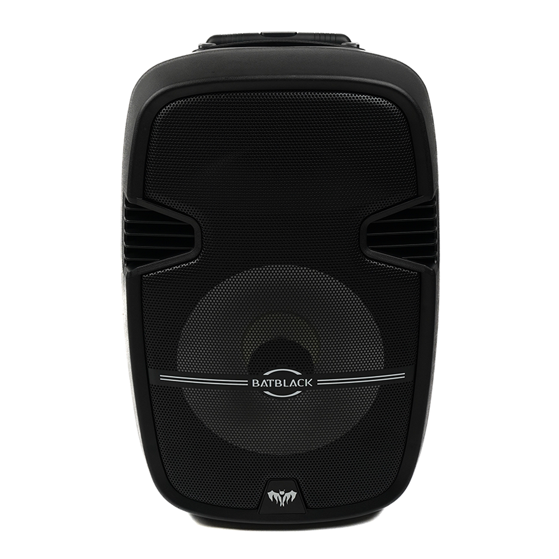 PARLANTE AMPLIFICADO BATBLACK 15″ 3000W CON BT,FM,USB,SD CARD,TWS C/2 MICROFONOS INALÁMBRICOS Y PEDESTAL CON BATERIAS 12V – 7AH